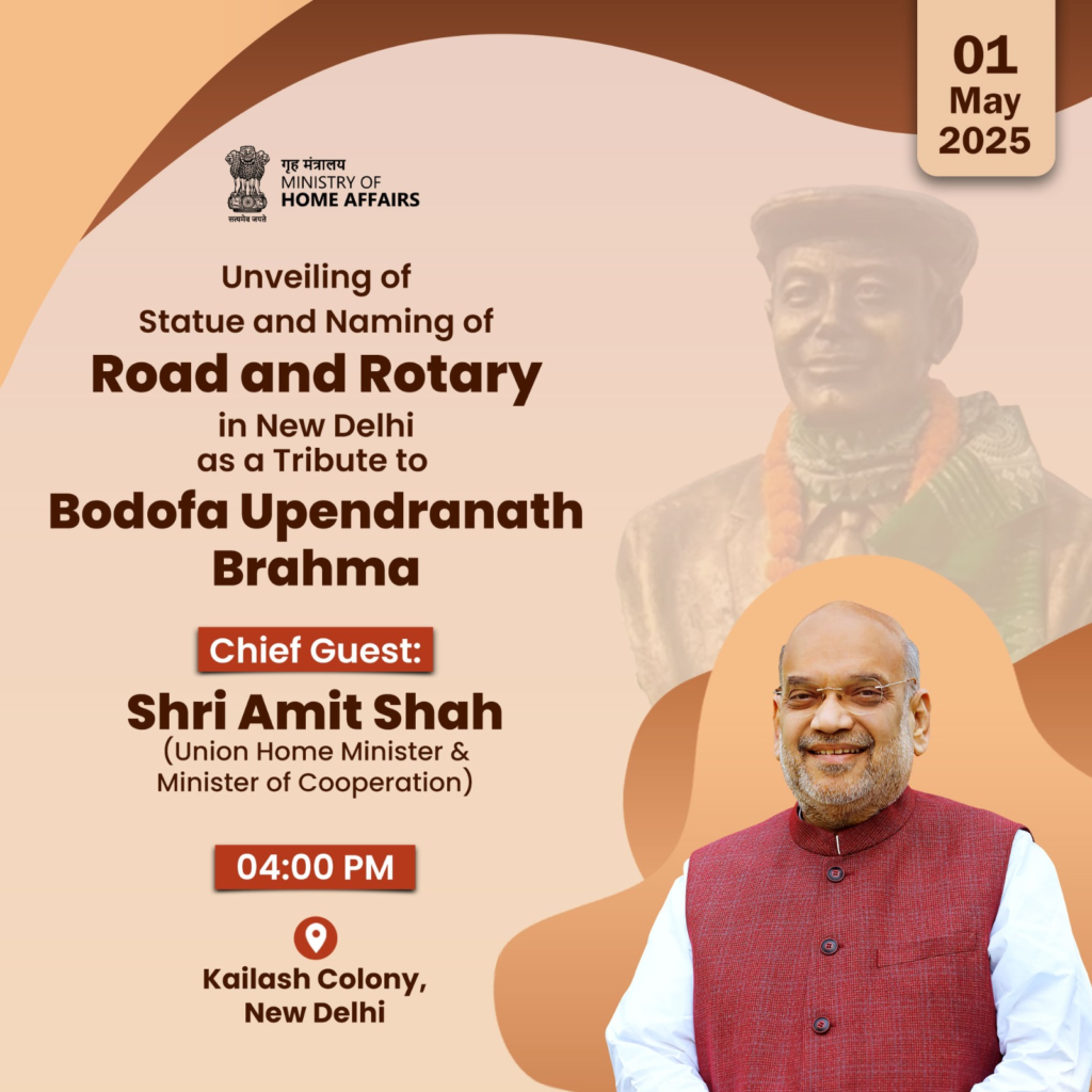 केंद्रीय गृह मंत्री एवं सहकारिता मंत्री श्री @AmitShah नई दिल्ली में बोडोफा उपेंद्रनाथ ब्रह्मा जी की प्रतिमा का अनावरण करेंगे तथा महान बोडो नेता के सम्मान में नामित सड़क का भी लोकार्पण करेंगे।