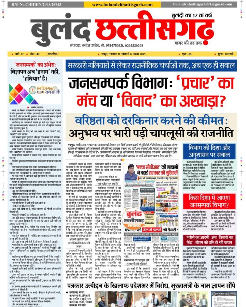 Home/छत्तीसगढ़/जनसंपर्क विभाग ‘प्रचार’ का मंच या ‘विवाद’ का अखाड़ा छत्तीसगढ़ Trending जनसंपर्क विभाग ‘प्रचार’ का मंच या ‘विवाद’ का अखाड़ा Buland ChhattisgarhNovember 11, 2025 2,151 Less than a minute Facebook Twitter Messenger Messenger WhatsApp Telegram buland chhattisgarh Related Articles शैक्षणिक भ्रमण या मौन की कीमत? 2 weeks ago जल संसाधन विभाग में तीन ठेकेदारों की तिकड़ी सीएम को बदनाम करने की पक रही खिचड़ी 4 weeks ago रायगढ़ से PMO तक गूंजा मामला: पत्रकार को 1 करोड़ का नोटिस, अधिकारी ने लिखित में घोषित किया ‘अपराधी’ December 9, 2025 Buland Chhattisgarh : खुद तो डूबेंगे, CM को भी ले डूबेंगे! December 9, 2025 Tagsbuland chhatisgarh jansmaprk vibhag prachar ka manch ya vivaad ka akhada Buland ChhattisgarhNovember 11, 2025 2,151 Less than a minute Facebook Twitter Messenger Messenger WhatsApp Telegram Show More Share Facebook Twitter Messenger Messenger WhatsApp Telegram