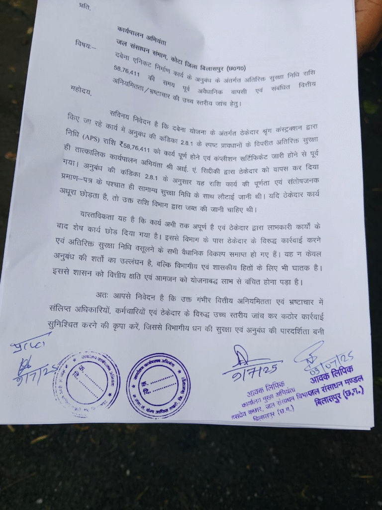 रायपुर। छत्तीसगढ़ जल संसाधन विभाग में वित्तीय अनियमितता का गंभीर मामला उजागर हुआ है। विभागीय अभिलेख और शिकायत पत्र के अनुसार, तत्कालीन कार्यपालन अभियंता सिद्दीकी पर आरोप है कि उन्होंने शृंग कंस्ट्रक्शन द्वारा किए जा रहे कार्यों के पूर्ण होने से पहले ही विभागीय मानकों को दरकिनार करते हुए ₹51,65,444 की अतिरिक्त सुरक्षा निधि (APS) जारी कर दी।