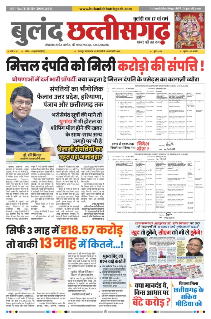 Home/E- Paper/मित्तल दंपत्ति को मिली करोड़ों की संपत्ति Uncategorized Trending मित्तल दंपत्ति को मिली करोड़ों की संपत्ति Buland Chhattisgarh37 seconds ago 2,184 Less than a minute Facebook Twitter Messenger Messenger WhatsApp Telegram Related Articles मुख्यमंत्री विष्णु देव साय ने अहमदाबाद में सौंपे निवेश प्रस्ताव, राज्य में निवेश का नया दौर November 11, 2025 क्या मिलेगा न्याय, या यूं ही दबा दिया जाएगा मामला? : March 29, 2025 राष्ट्रगान की गूंज से गूंज उठेगा अंबिकापुर: भाजपा सरगुजा की निगम में नई पहल…! March 29, 2025 माफियाओं को सरकारी संरक्षण? कब जागेगा प्रशासन? March 29, 2025 Buland Chhattisgarh37 seconds ago 2,184 Less than a minute Facebook Twitter Messenger Messenger WhatsApp Telegram Show More Share Facebook Twitter Messenger Messenger WhatsApp Telegram