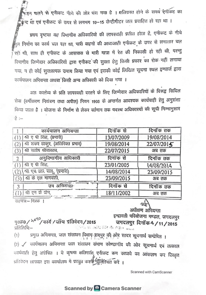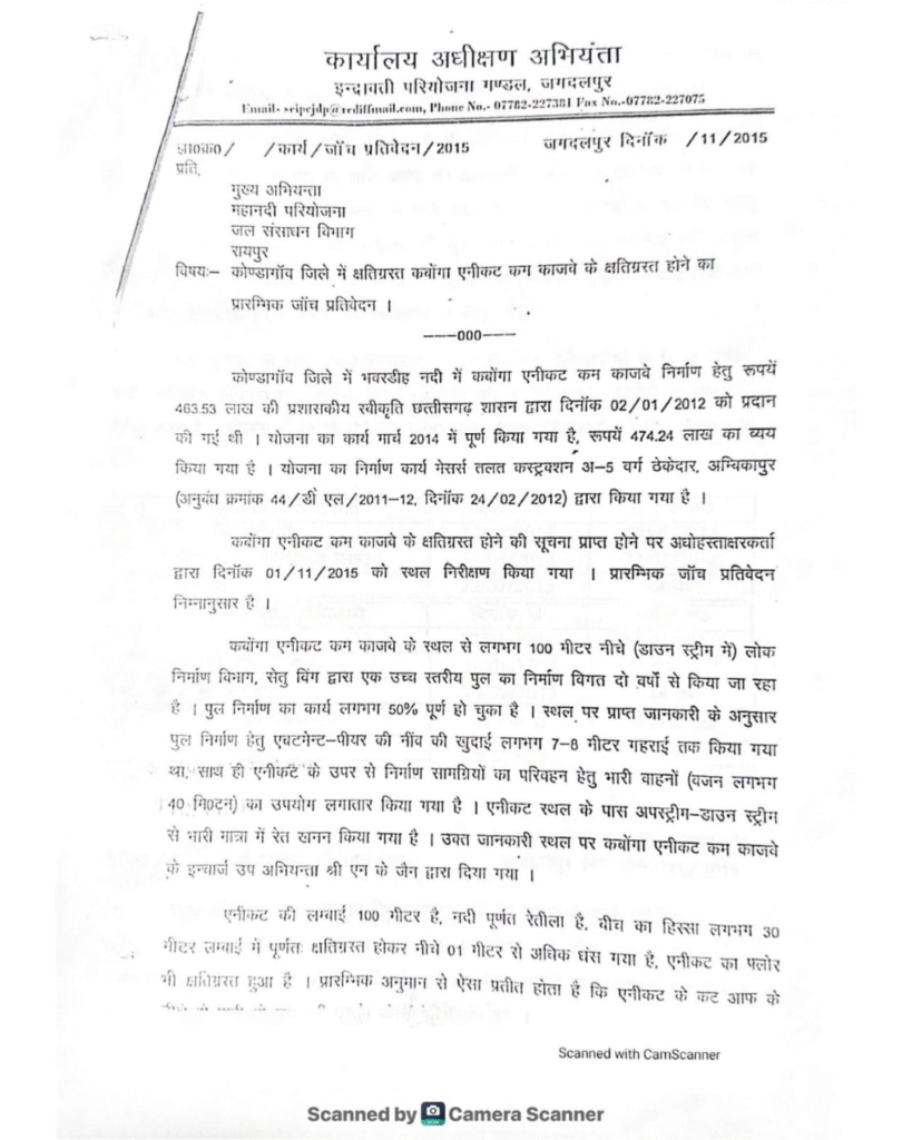 कार्यालय अधीक्षण अभियंता, हसदेव परियोजना, जगदलपुर की जांच रिपोर्ट में कोंडागांव जिले में बने एनीकट-कम-कारजवे निर्माण में भारी अनियमितताएं उजागर हुई थीं—
