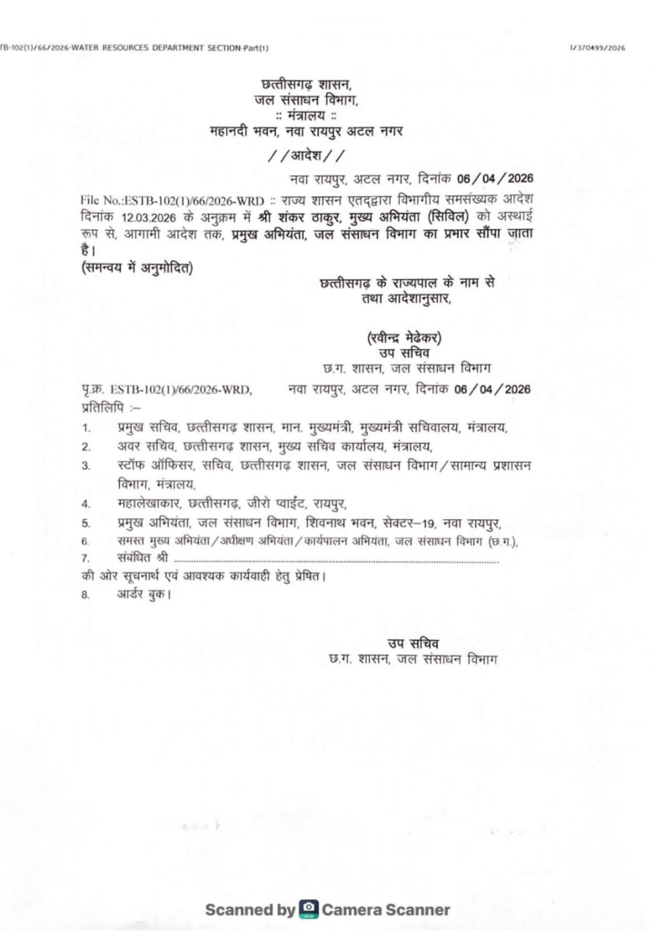 छत्तीसगढ़ के जल संसाधन विभाग में नियुक्ति को लेकर बड़ा विवाद खड़ा हो गया है। 2015 की जांच रिपोर्ट में जिन अनियमितताओं और लापरवाही का खुलासा हुआ था, उसी परियोजना से जुड़े अधिकारी को 2026 में प्रमुख अभियंता (ENC) जैसे महत्वपूर्ण पद पर बिठा दिया गया। इस फैसले ने सरकार की पारदर्शिता और जवाबदेही पर गंभीर सवाल खड़े कर दिए हैं। साथ ही मंत्रालय की भूमिका पर भी संदेह जताया जा रहा है कि कहीं यह कदम मुख्यमंत्री की छवि को नुकसान पहुंचाने की सोची-समझी चाल तो नहीं।